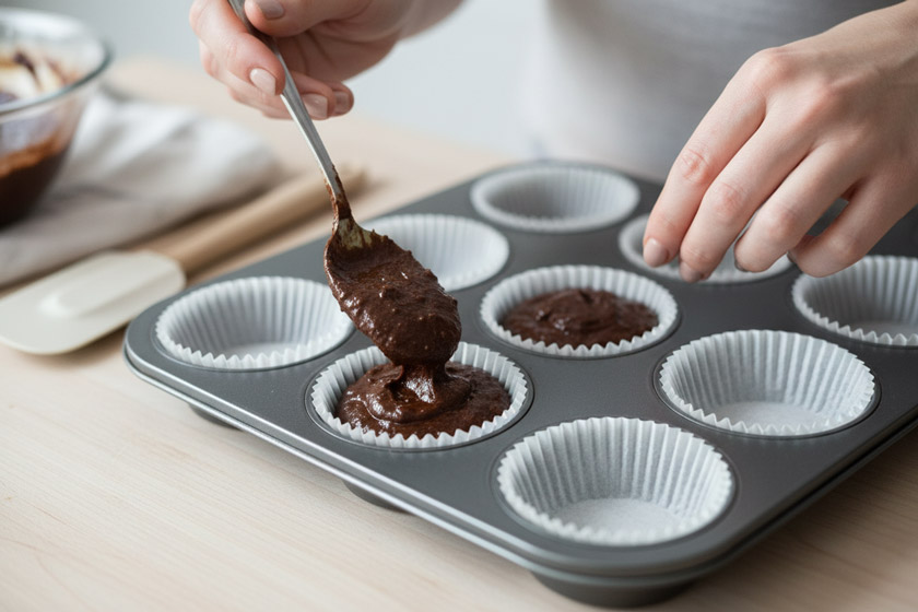 - Backofen vorbereiten: Ofen auf 180 °C Ober-/Unterhitze vorheizen und ein Muffinblech mit Papierförmchen auslegen.